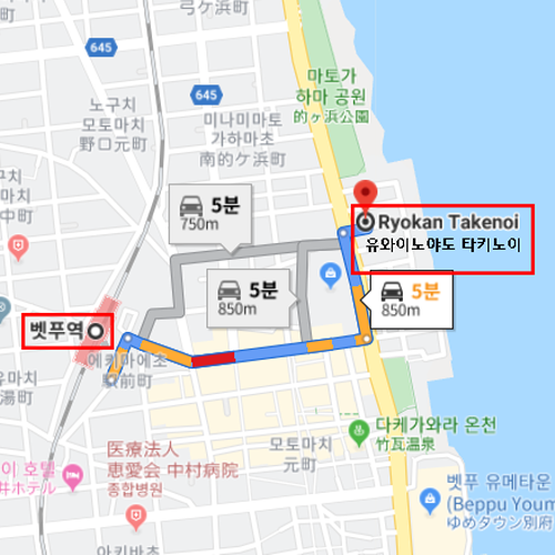 숙박지 주변벳부역에서 차로 약 5분 소요 |