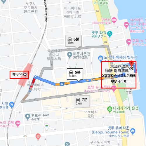숙박지 주변벳부역에서 차로 약 5분 소요 (도보 약 13분) |