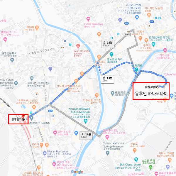 | 시설 주변 정보 | ★ 코스모스 면세 드럭스토어(ディスカウントドラッグコスモス湯布院店) : 도보 약 7분 소요 - 영업시간: 10:00~21:00 - 전화번호: 0977-28-2911 ★ 세븐일레븐 편의점(セブン‐イレブン 湯布院湯の坪店) : 도보 약 6분 소요 - 영업시간: 24시간 - 전화번호: 0977-84-5538 ★유노츠보 거리(湯の坪街道) : 도보 약 6분 소요 |