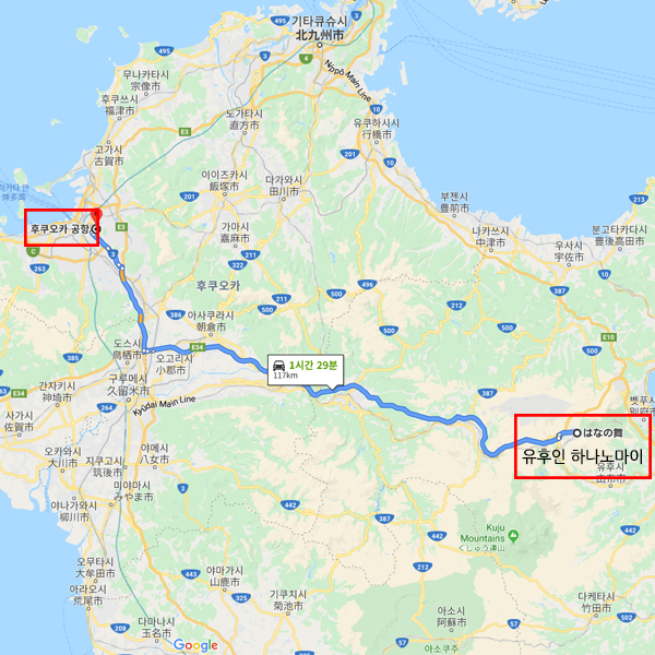 공항 기준후쿠오카 공항에서 차로 약 1시간 30분소요 |