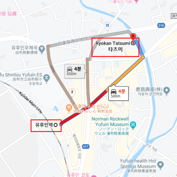 숙박지 주변유후인 역에서 차로 약 4분 소요 (도보 약 7분 소요) |
