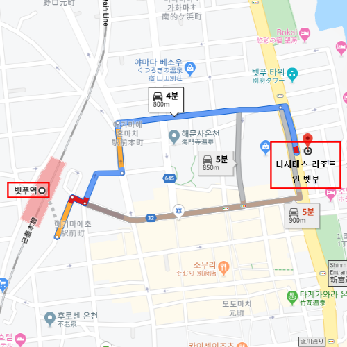 숙박지 주변벳부역에서 차로 약 4분 소요 (도보 약 10분) |