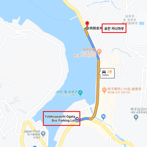 | [교통 안내] -고속버스 혹은 전철을 이용하여 가라츠역에 도착한 후, 버스로 요부코버스정류장(약 30분)에서 하차, 카나마루까지 도보 7분 또는 송영 이용 -가라츠역에서 택시로 약 30분 소요 |