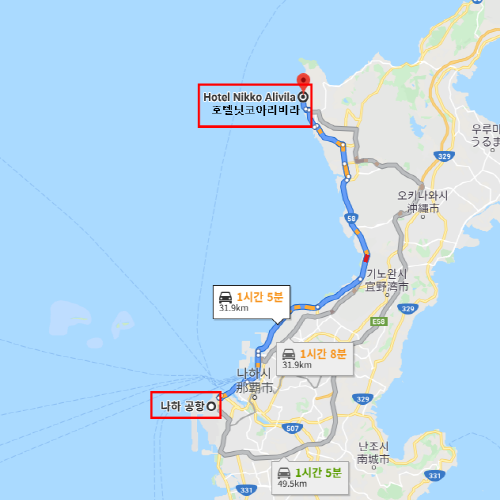 공항 기준나하 공항에서 차로 약 1시간 5분 소요 |