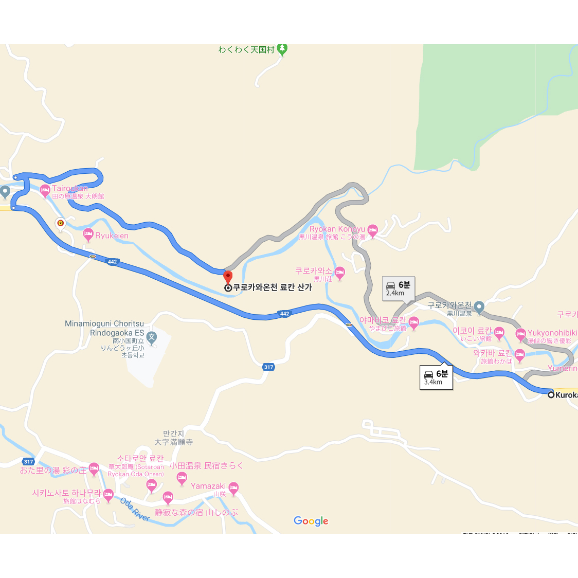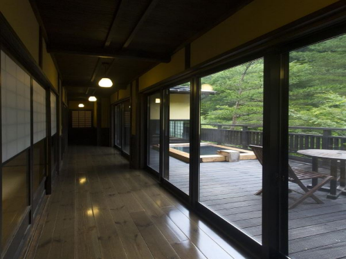 쿠로가와의 온천지 안에서도 자연과 가장 잘 조화를 이루고 있는 쿠로가와의 료칸산가는 쿠로가와 강을 끼고 강물소리가 잔잔하게 들리며 온천욕을 즐길 수 있는 료칸이다. 주변에는 다른 건물이 하나도 없어 자연과 료칸만의 절묘한 분위기를 느낄 수 있으며 료칸의 부지안에는 각종 온천시설들이 즐비하고 있어 일상생활에서 벗어나 자유로운 기분으로 숙박을 즐길 수 있는 곳이기도 하다. 료칸의 부지는 총 3,000여평으로 전세탕 혼욕온천탕등이 있으며, 총 객실은 15객실로서 아늑한 분위기 마져 자아낸다. |