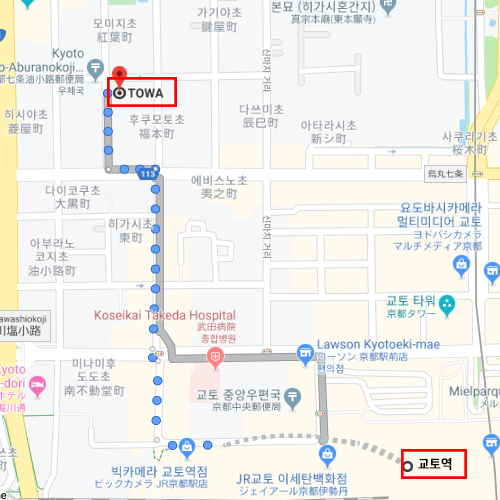 | 시설 주변 정보 | ★ 돈키호테(ドン・キホーテ 京都アバンティ店) : 도보 약 20분 소요 - 영업시간: 10:00~24:00 - 전화번호: 075-693-4511 ★ 빅카메라 교토점(ビックカメラ JR京都駅店) : 도보 약 7분 소요 - 영업시간: 10:00~21:00 - 전화번호: 075-353-1111 ★ 패밀리마트 편의점(ファミリーマート 七条新町店) : 도보 약 4분 소요 - 영업시간: 24시간 - 전화번호: 075-353-4126 |