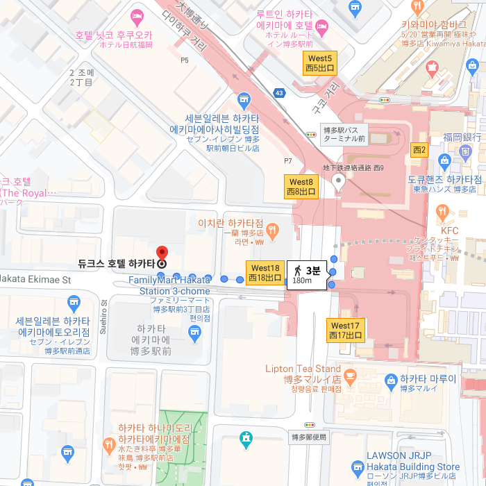 -후쿠오카 공항에서 JR 전철로 5분 밖에 걸리지 않는 곳에 위치한 하카타는 중세에 무역 도시로 번창한 아시아의 관문으로서 큐슈지역의 중요한 교통의 요지이다. 하카타역 하카타출구에서 바로 눈 앞에 보이는 호텔이 듀크스호텔하카타이다. 여행과 비즈니스 업무로 인한 피곤함을 조금이나마 덜어줄 최고의 입지 호텔이며, 공항과의 접근성도 뛰어나 굉장한 편리성을 제공하는 곳이다. 후쿠오카 시내 관광에서 빼놓을 수 없는 캐널시티하카타는 도보 5분 거리에 있어서, 여행 마지막날 공항으로 돌아가는 당일까지 마음껏 쇼핑과 맛집탐방이 가능하다. 호텔 입구에서부터 유럽의 클래식한 분위기에 압도되고, 유럽에서 직수입한 가구를 배치한 객실에서는 차분한 분위기의 휴식공간을 연출하고 있다. 유럽의 중후하고, 옛스럽지만 세련되고 기품이 느껴지는 듀크스호텔하카타를 추천한다. |
