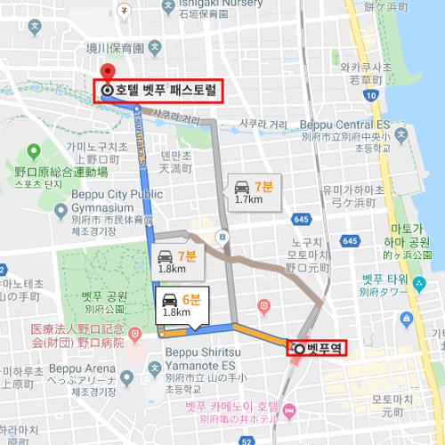 숙박지 주변벳부역에서 차로 약 6분 소요 |