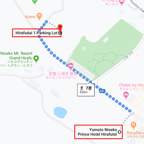 신치토세 공항에서 차로 약 2시간 10분 소요  히라프 제일 주차장 버스정류장에서 도보 약 7분 소요