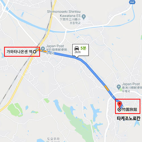 숙박지 주변JR카와타나온천(川棚温泉)역에서 차로 약 5분 소요 |