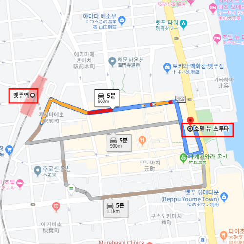 숙박지 주변벳부역에서 차로 약 5분 소요 |