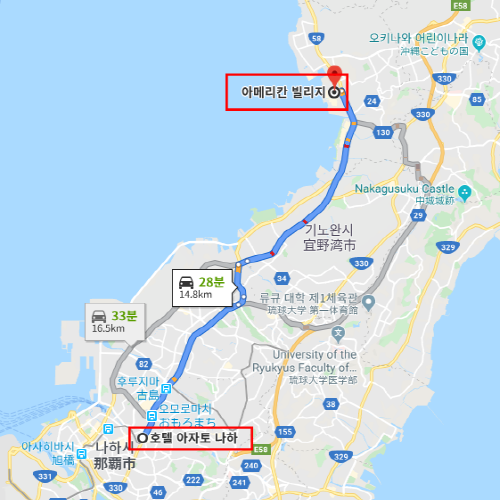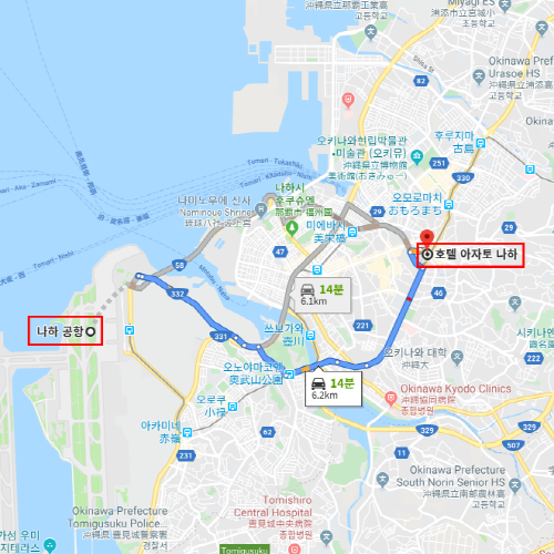 나하 공항에서 차로 약 14분 소요  아메리칸 빌리지까지 차로 약 28분 소요