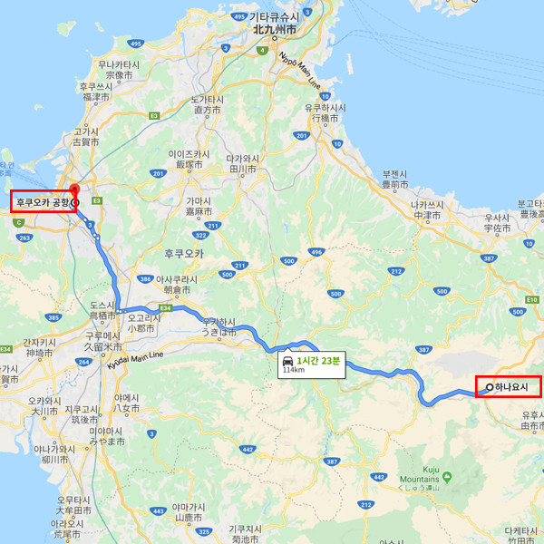 공항 기준후쿠오카 공항에서 차로 약 1시간 30분소요 |
