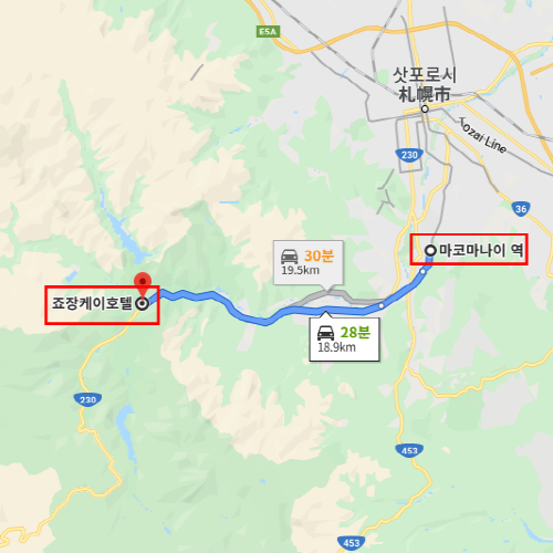 공항 기준신치토세 공항에서 차로 약 1시간 15분 소요 |